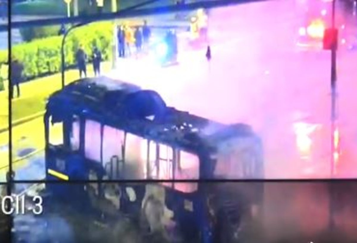 Bus del Sitp incinerado en marchas del 1 de mayo Crédito: Captura de video Secretaría de Gobierno de Bogotá