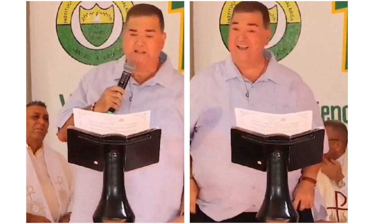 El hecho, que quedó registrado en video, generó carcajadas entre los presentes, incluidos cuatro sacerdotes que estaban tras el mandatario en la tarima y hasta la asistente de Chams, quien de inmediato acudió en su ayuda.
