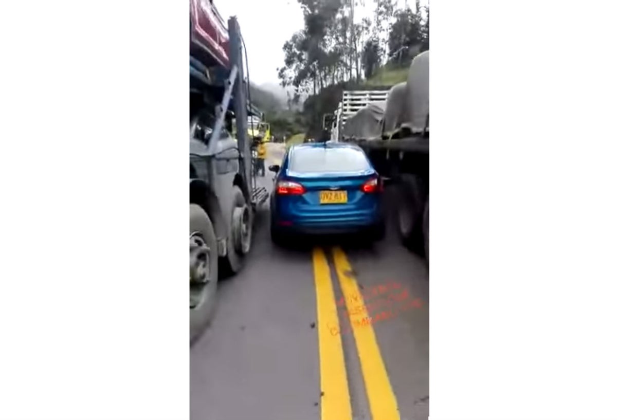 Los vehículos, por su gran tamaño, no tuvieron cómo dar espacio para que el carro pudiera pasar y evitar la colisión. Por fortuna, uno de los conductores de las tractomulas se percató de la imprudencia que se iba a cometer y orilló lo que más pudo el carro. Su acción permitió evitar una tragedia.