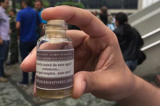 Daniel Suárez, vocero del Movimiento Ciudadanos por el Aire, explicó que entregaron 50 botellas que contenían agua de la quebrada Santa Elena, la cual, pese a su riqueza, hoy presenta altos niveles de contaminación. El ambientalista le entregó una botella al alcalde y lo retó a que tomara un poco de esa agua.