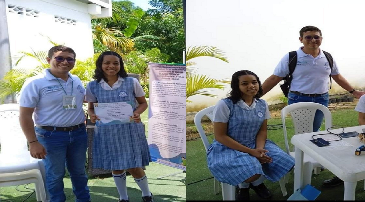Angeline García Cuesta y su docente Jorge Sánchez. Crédito: Cortesía Minciencias