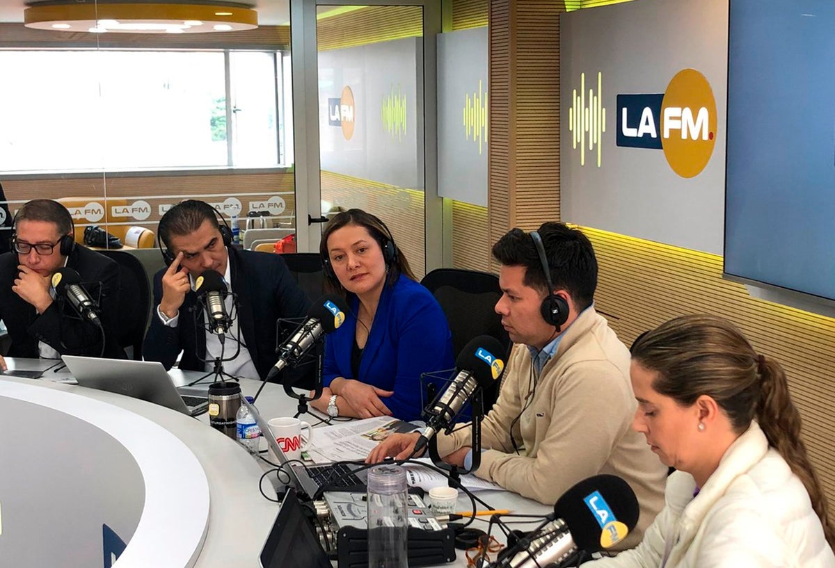 Ángela Garzón (de azul), candidata a la Alcaldía de Bogotá, en la mesa de trabajo de LA FM, en Bogotá