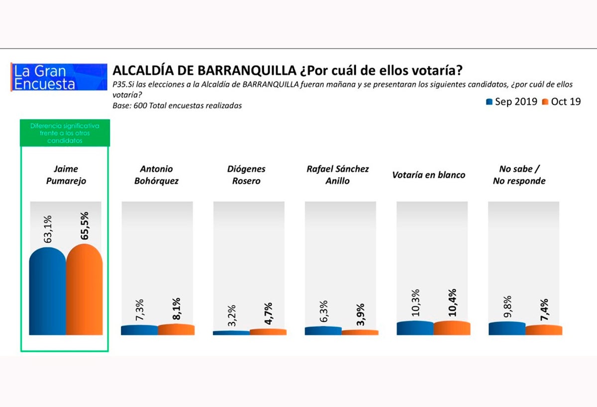La Gran Encuesta de LA FM, Noticias RCN, RCN Radio, La República, El País y El Colombiano, hecha por la firma Yanhaas, deja ver la intención de voto en la ciudad de Barranquilla. Jaime Pumarejo tiene una intención de voto del 65,5 por ciento, frente a Antonio Bohórquuez, con el 8,1 por ciento y otros candidatos con índices mucho más bajos.