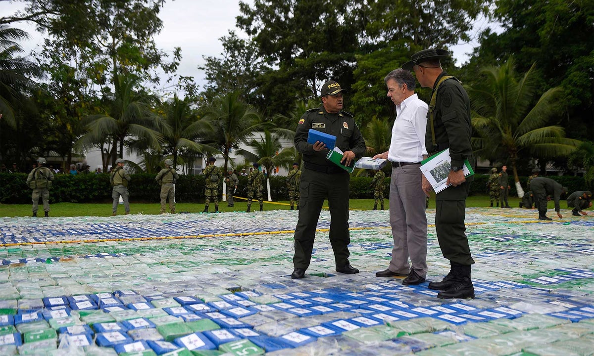 Junto al ministro de Defensa, Luis Carlos Villegas, y los altos mandos militares y policiales, el presidente Juan Manuel Santos arribó a Apartadó, donde calificó este golpe como el más grande contra el narcotráfico en el país porque “es la mayor incautación de clorhidrato de cocaína efectuada por la Policía Nacional en una sola operación”.