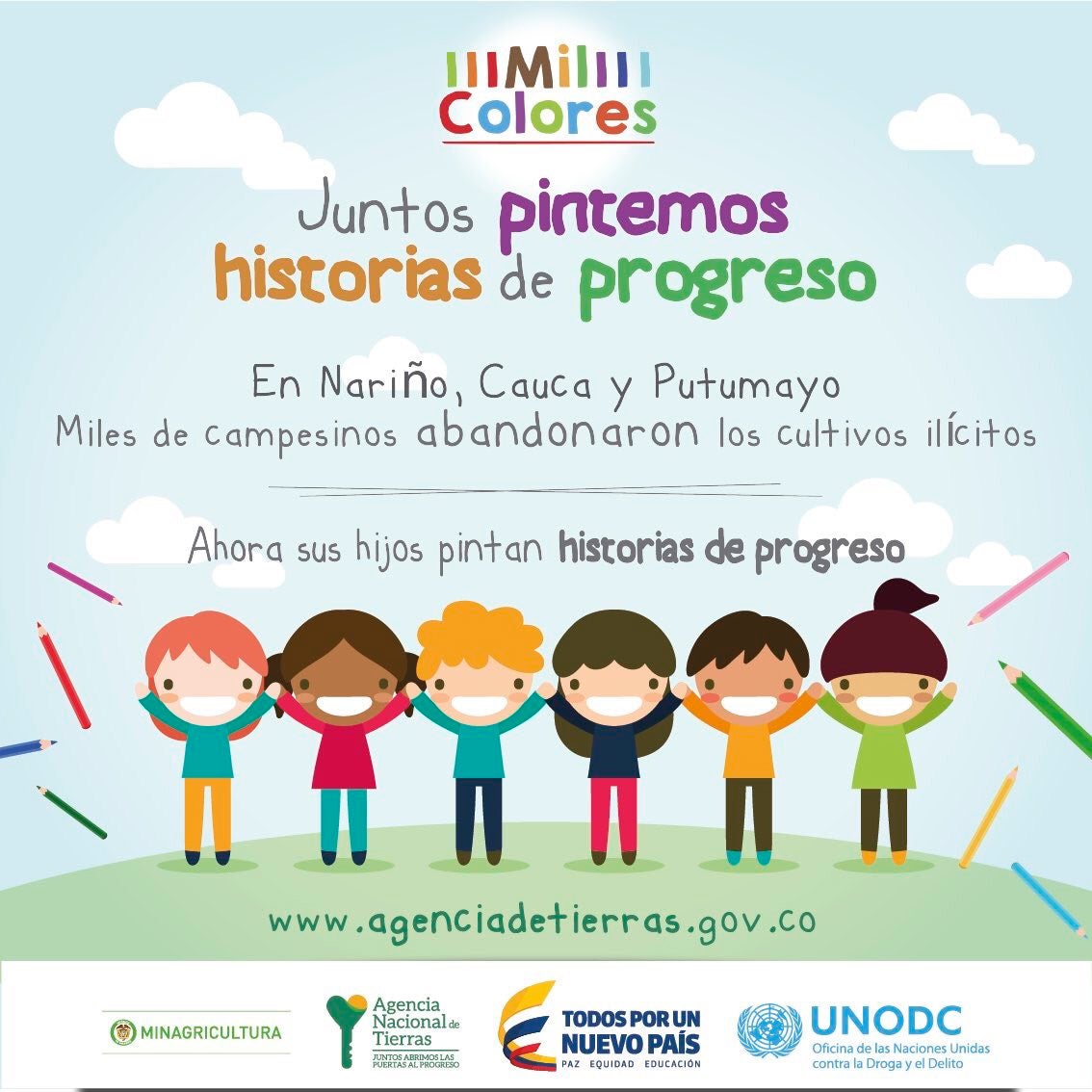 La Agencia Nacional de Tierras (ANT) y la Oficina de las Naciones Unidas contra la Droga y el Delito (UNODC) trabajan en la campaña “Mil Colores: pintemos juntos historias de progreso”, una iniciativa que busca vincular a todas las entidades del Estado y a la empresa privada para que donen lápices de colores que les serán entregados a los hijos de 6.400 familias campesinas que dejaron los cultivos ilícitos y hoy permanecen en la legalidad.