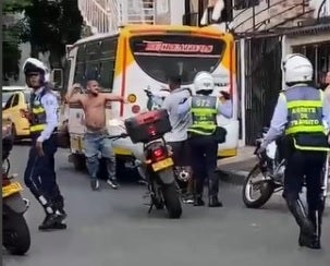Finalmente, los funcionarios lo detuvieron en la Calle 17 con Carrera 56. Allí y como se ve en el video, el hombre, sin camisa y con una correa salió del vehículo a agredir a los guardas de tránsito.
