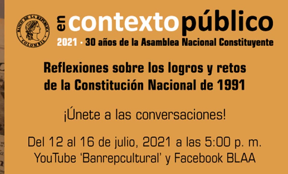 En Contexto Público es un programa de la Biblioteca Luis Ángel Arango que abre espacios de discusión sobre temas de interés público general para debatir y reflexionar desde la experiencia y la academia. En la versión 2021, este espacio se abre para reflexionar sobre estos treinta años de la Constitución Política de Colombia de 1991. El programa se desarrollará del 12 al 16 de julio por YouTube banrepcultural y Facebook Biblioteca Luis Ángel Arango, a las 5:30 p. m., la participación es gratuita.