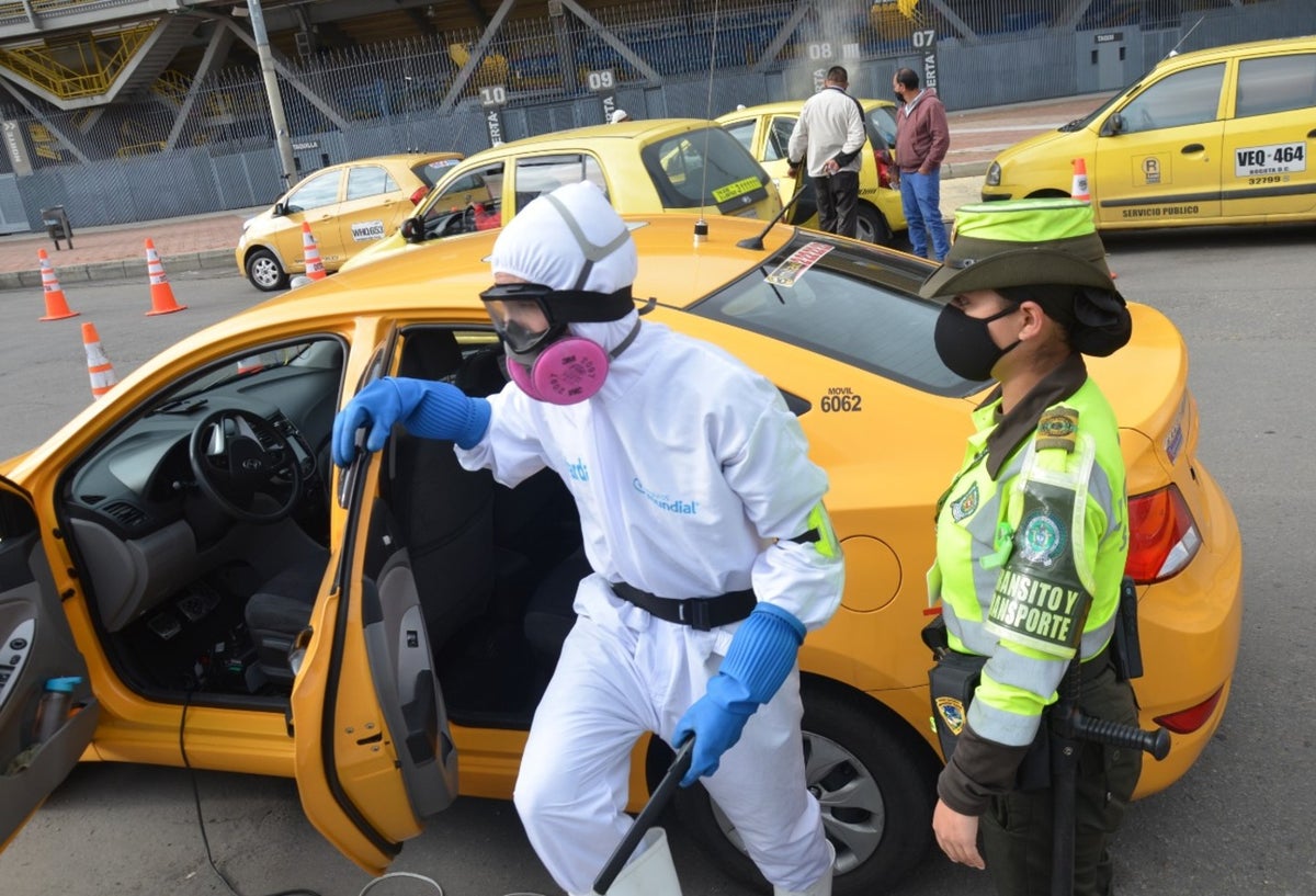 Bogotá es la ciudad con mayor número de contagios por coronavirus en el país y por ello, la Policía de Tránsito de la ciudad adelanta una campaña de desinfección de taxis, uno de los medios de transporte más usados en esta época, para evitar la propagación de la Covid-19 y mantener seguros a los mismos conductores.