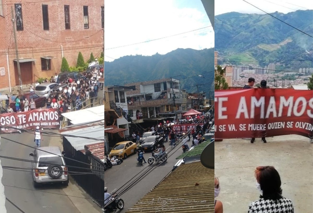 Durante esta marcha se alcanzan a escuchar disparos, pitos de carros y motos, y aplausos de los asistentes, quienes llevan una pancarta en fondo rojo con las palabras en mayúsculas: "OSO TE AMAMOS. NO SE MUERE QUIEN SE VA. SE MUERE QUIEN SE OLVIDA".