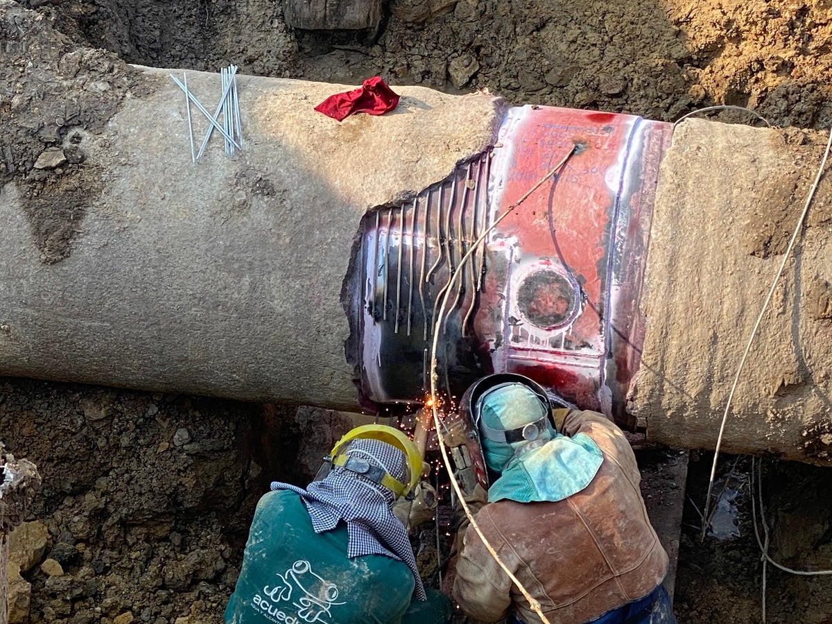 Funcionarios y expertos trabajan en una tercera fisura que encontraron en el tubo matriz que surte de agua a Chía, población que cumple más de un día sin el servicio de acueducto para cerca de 130 mil habitantes.