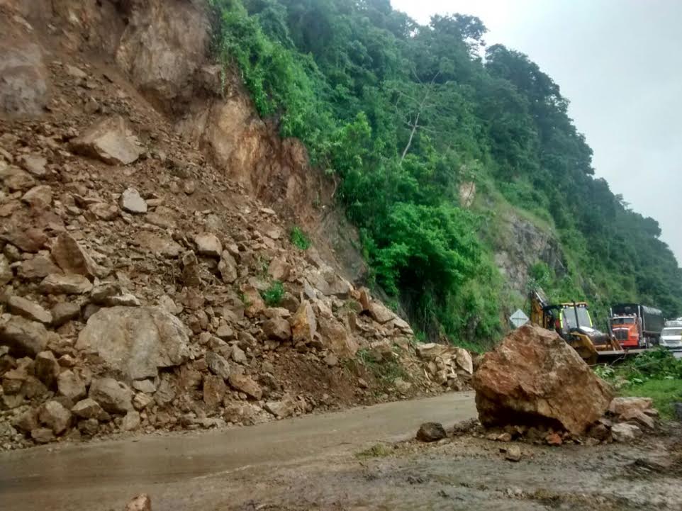 El derrumbe produjo el taponamiento de ambos carriles, por lo que se requirió de maquinaria pesada para remover las piedras y arena de la vía.