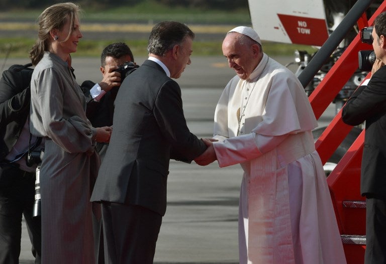 El papa bajó del avión a las 4:36 p.m. de forma tranquila. La bienvenida al Papa se dio en medio de cánticos gregorianos y con las principales figuras del Gobierno y del Estado colombiano. Esta comitiva, presidida por el presidente Juan Manuel Santos, la primera dama y el nuncio apostólico Ettore Balestrero, recibió al santo padre.