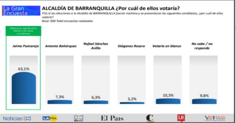 El candidato de la coalición multipartidista, Jaime Pumarejo, lidera la intención de voto con un 63.1%, seguido de Antonio Bohórquez del Polo Democrático con un 7.3%.