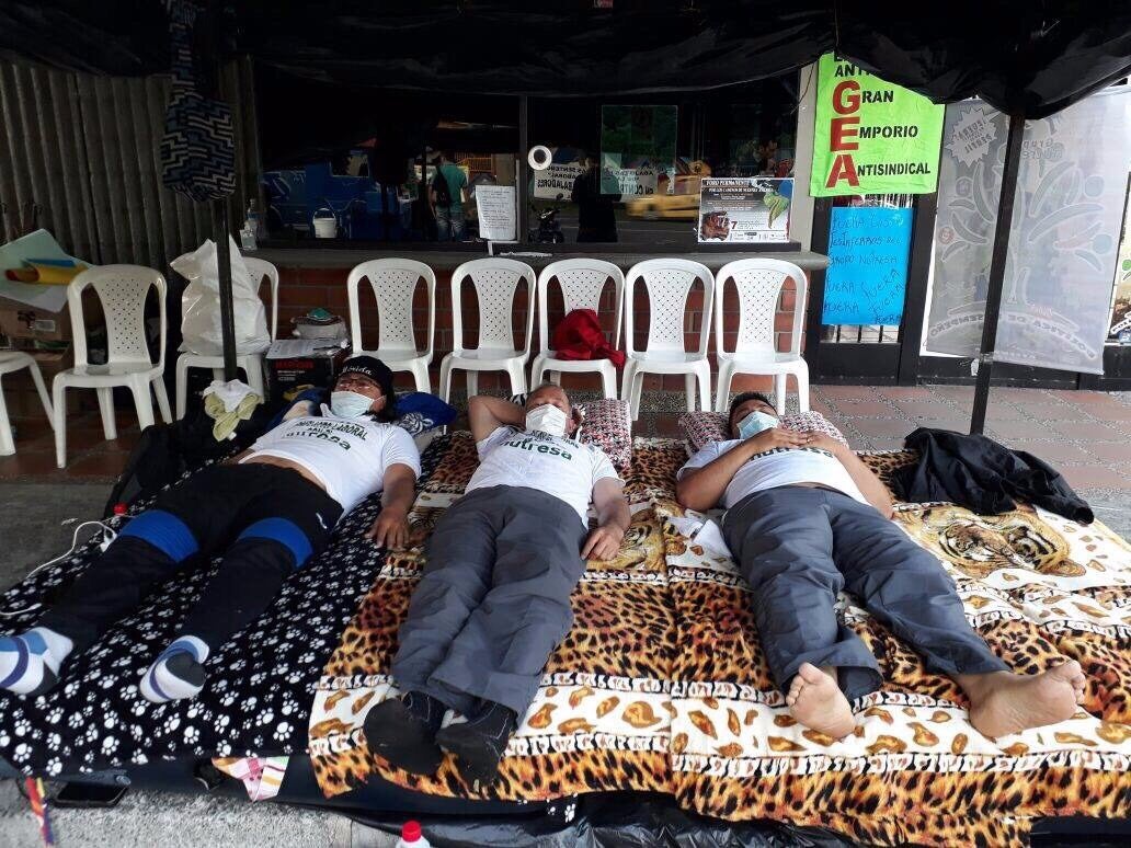 Los empleados del Grupo Nutresa que están asociados en los sindicatos Sintrainal y Sintralimenticia, completan una semana en huelga de hambre. Los trabajadores sacaron cobijas y tapabocas para apostarse en la sede de la avenida Guayabal con calle 20, en el sur de Medellín.