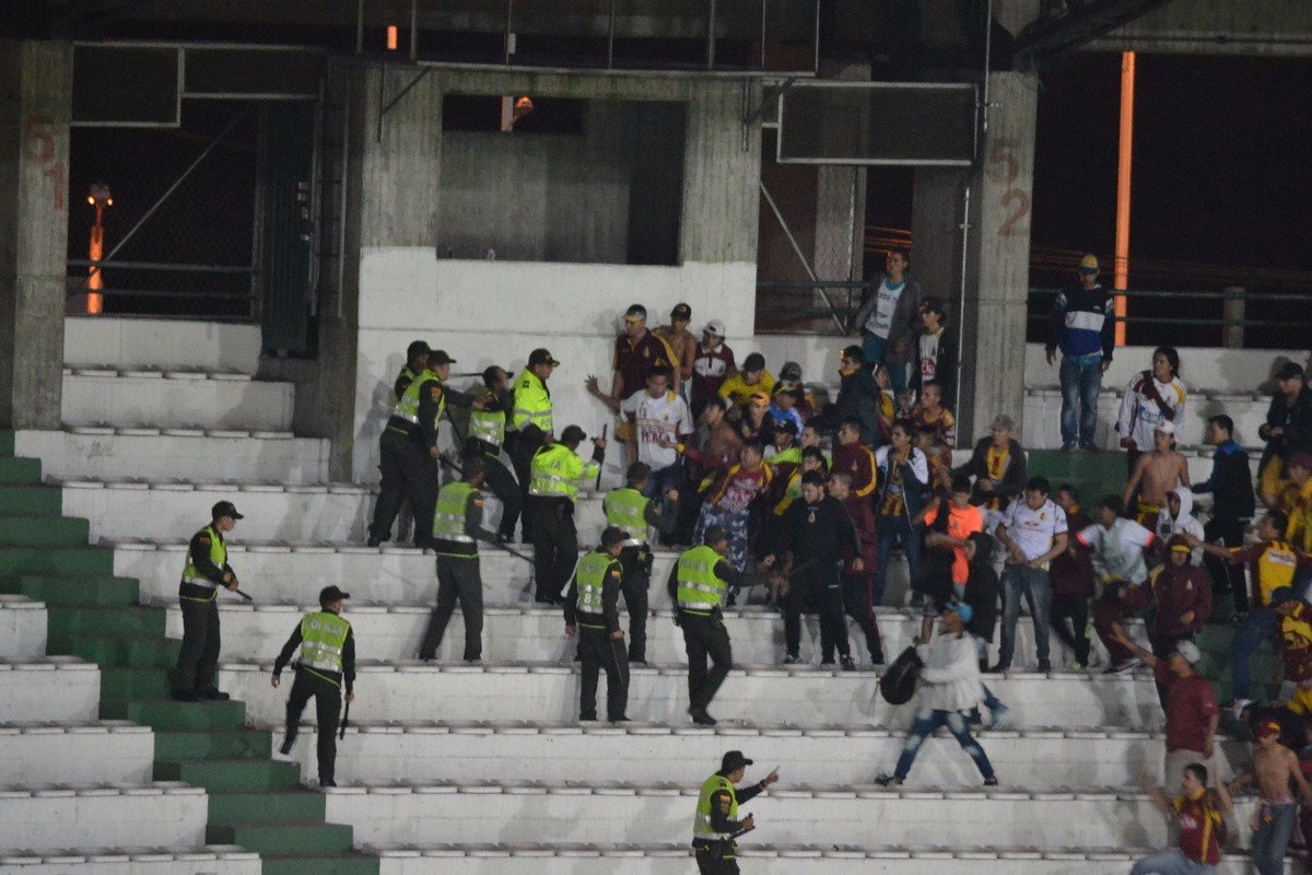 De acuerdo con informaciones, la confrontación se registró cuando al parecer hinchas del Once Caldas intentaron arrebatar las banderas que portaban los seguidores del Deportes Tolima, lo que desencadenó la disputa.}