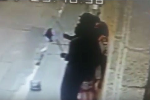 Una vez cometido el acto, las estatuas humanas se quedan inmovilizadas por unos segundos, intercambian un par de miradas, y luego uno de ellos lanza lo que sacó de la mochila de la turista a su compañero, quien se retira de la escena registrada por una cámara de uno de los establecimientos cercanos.