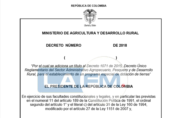 En un proyecto de decreto conocido en exclusiva por LA FM, el Gobierno prioriza a las Farc cómo población especial para entregarles tierras. De acuerdo con el proyecto de decreto, "se crea el Sistema Nacional de Reforma Agraria y Desarrollo Rural Campesino, se establece un subsidio para la adquisición de tierras, se reforma el Instituto Colombiano de la Reforma Agraria y se dictan otras disposiciones".