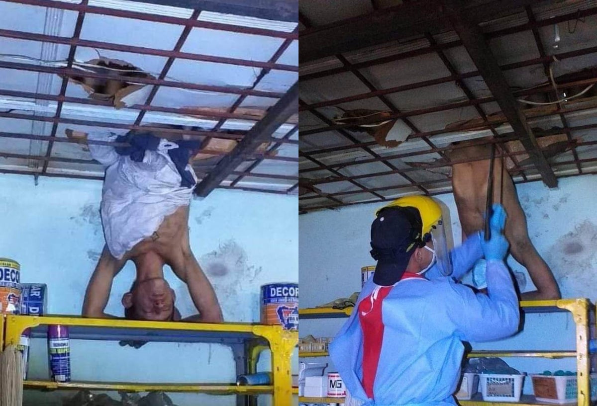 El hombre, en medio de su anhelo de robar, terminó atrapado boca abajo, en una posición en donde escapar sin ayuda era imposible.