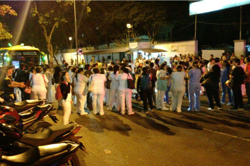 Desde hace cinco días, empleados como enfermeros, médicos, camilleros, entre otros, se declararon en cese de actividades, y ante la falta de pago de sus salarios han realizado continuas protestas frente al Hospital Universitario de Santander.