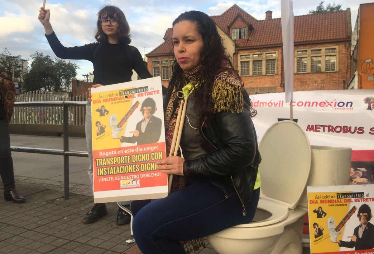 Con inodoros que fueron puestos al ingresar a la estación, los trabajadores pidieron una pronto solución a su problema. “Hoy es el día mundial del retrete y aprovechamos para conmemorarlo, más nosotros los trabajadores de Transmilenio que no podemos entrar a un baño”.