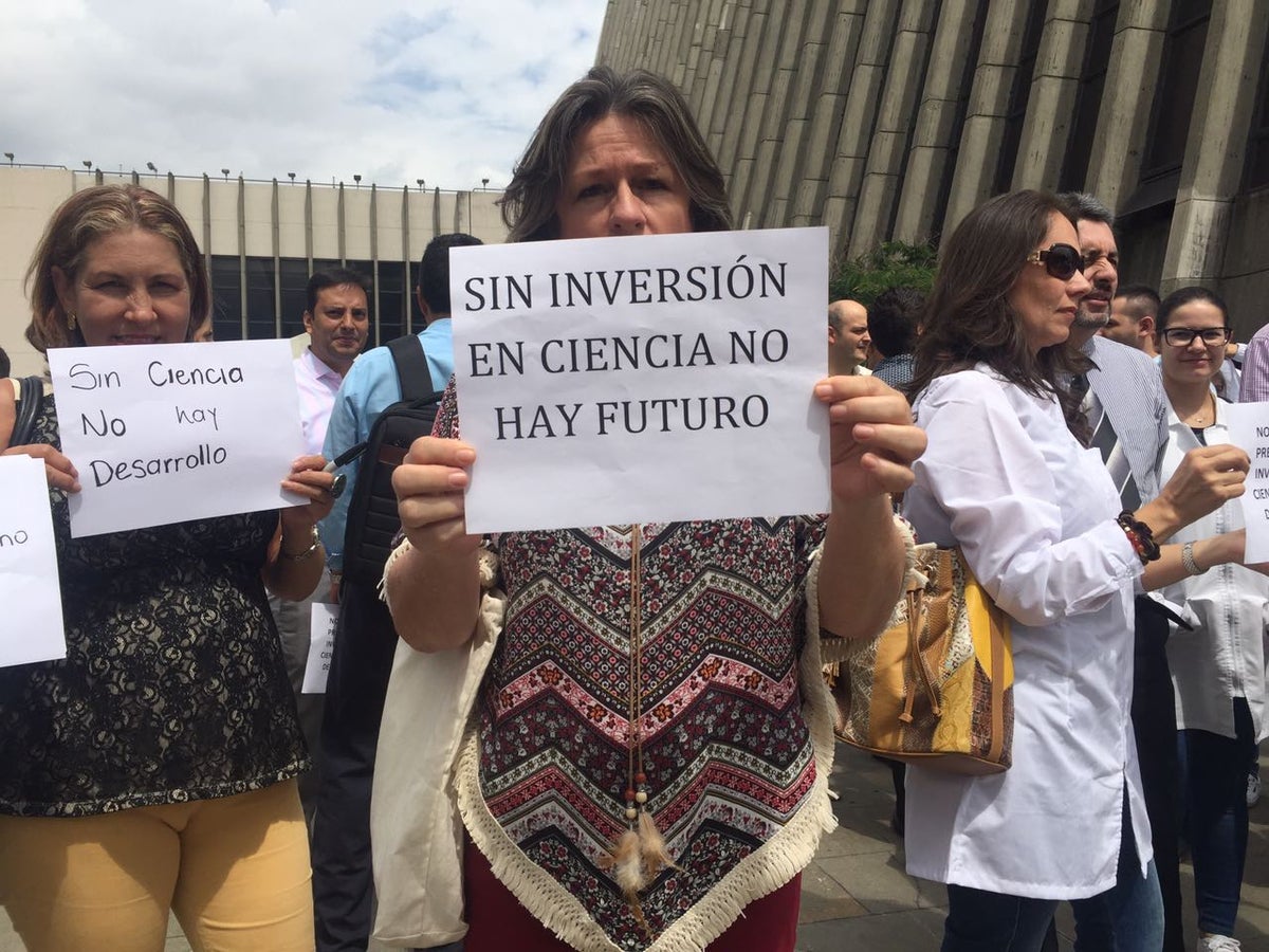 Cerca de 200 profesores, científicos y estudiantes exigieron que el presupuesto de Colciencias no se reduzca de 370 mil millones de pesos a 222 mil millones, tal y como pretende hacerlo el Gobierno Nacional. Advierten que si esto sucede, la ciencia se quedará sin fondos para desarrollar los proyectos.