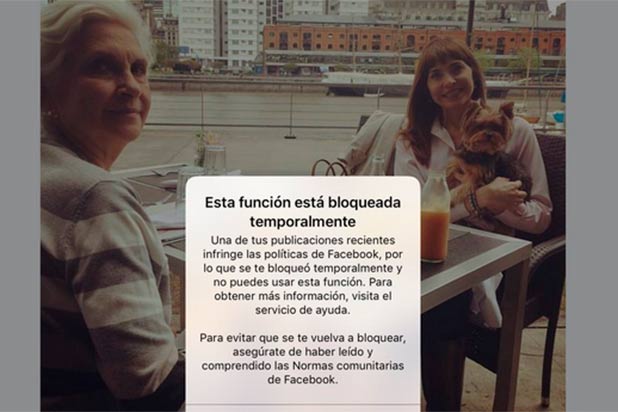 Facebook, por su parte, bloqueó la cuenta por cuenta de sus políticas. "Una de tus publicaciones recientes infringe las políticas de Facebook, por lo que se te bloqueó temporalmente y no puedes usar esa función. Para obtener más información, visita el servicio de ayuda. Para evitar que se te vuelva a bloquear, asegúrate de haber leído y comprendido las normas comunitarias de Facebook", se lee en el mensaje de notificación a la actriz Lorena Meritano.
