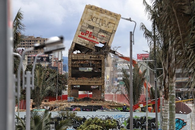 Este martes continuó la demolición del monumento a Los Héroes ubicado en la Autopista Norte con Calle 80 en Bogotá. Los obreros pasaron de las picas y martillos a las excavadoras para tumbar gran parte de la estructura central.