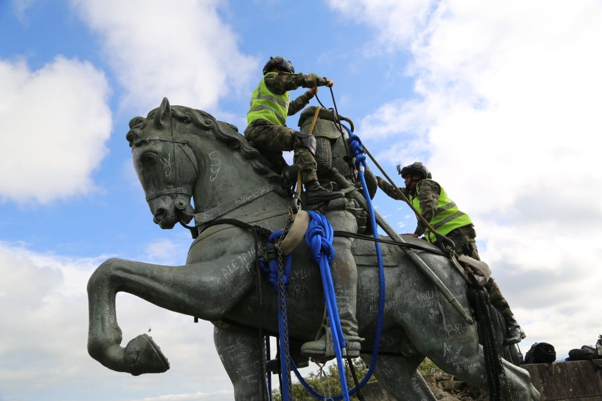 La estatua ecuestre de Sebastián de Belalcázar fue trasladada para ser restaurada por el Ejército. Crédito: Cortesía Aviación del Ejército