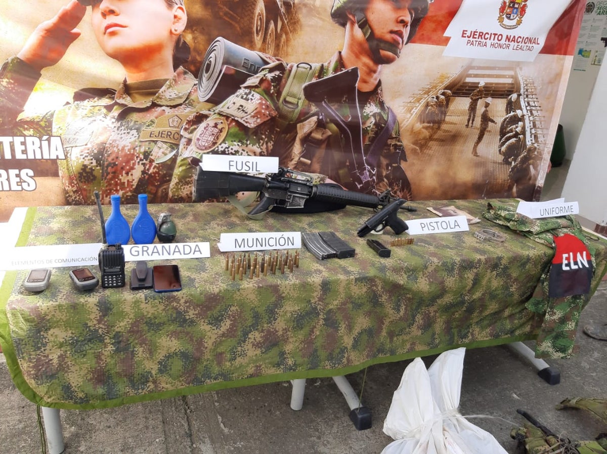 Tras el operativo, las autoridades incautaron un fusil M16, una pistola, una granada de mano, proveedores para fusil, 34 cartuchos, un radio de comunicaciones, dos geoposicionadores, un celular, un camuflado, unas esposas, un brazalete alusivo al ELN y material de intendencia.