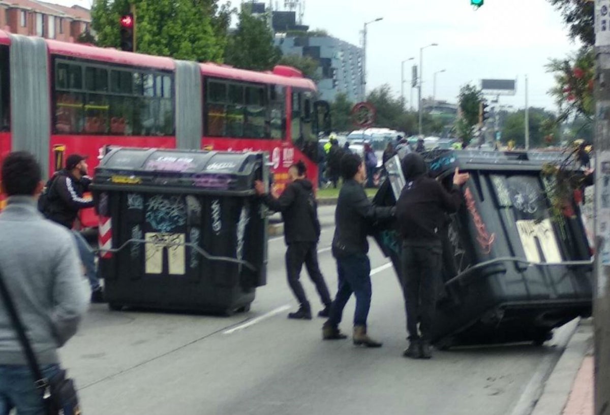 Sujetos lanzaron los contenedores sobre las vías generando bloqueos. Los buses de Transmilenio quedaron totalmente detenidos y los ciudadanos comienzan a caminar sobre las vías en busca de transporte.