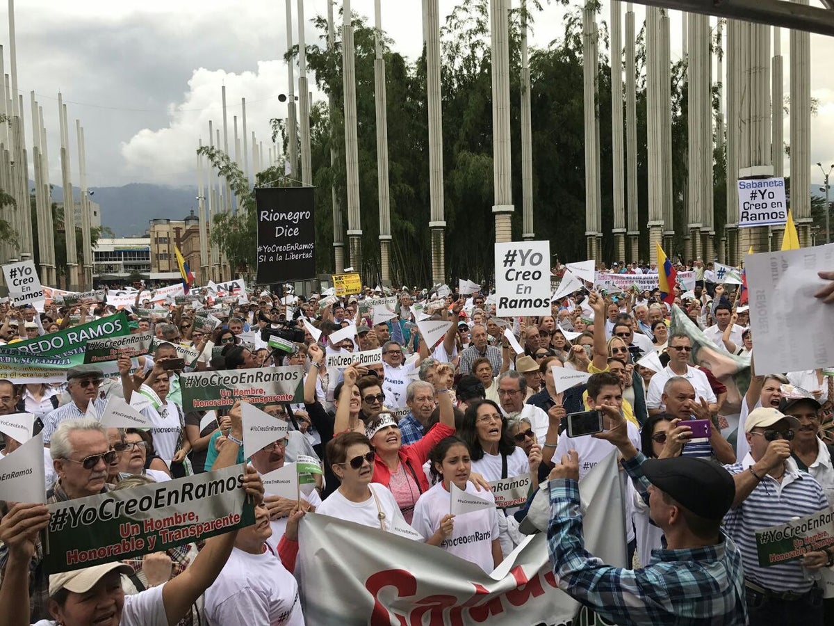 Con pancartas que llevaban la etiqueta #YoCreoEnRamos, los manifestantes llegaron desde las 10:00 de la mañana y ocuparon más de la mitad de la plaza que se encuentra cerca al centro administrativo La Alpujarra de la capital de Antioquia.