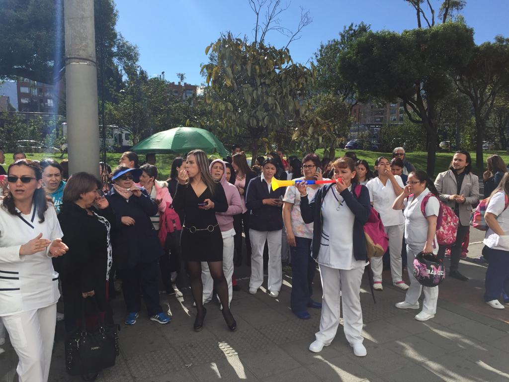 En la mañana de este martes se registra un plantón al frente de la Clínica Jorge Piñeros Corpas en el norte de Bogotá. Médicos, enfermeras, personal auxiliar, administrativo de la IPS Esimed reclaman el pago de sus salarios retrasados y demás prestaciones sociales.
