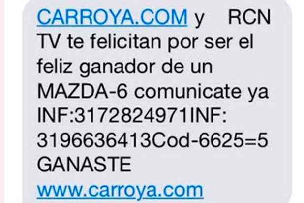 El caso en particular tiene que ver con un mensaje de texto en el que se felicita a la víctima por haberse ganado un carro. El mensaje dice: "carroya.com y RCN TV te felicitan por ser el feliz ganador de un Mazda 6. Comunícate ya: info: 31728249 71-3196634113. Cod:6625-5 .Ganaste".