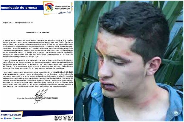 Luego que las directivas de la Universidad Militar Nueva Granada conocieran el descontento de sus estudiantes ante la participación de Geovanny Espitia Hernández en un intento de hurto en el occidente de Bogotá, la Universidad Militar, dirigida por el brigadier general (RA) Hugo Rodríguez Durán, se pronunció a través de un comunicado.