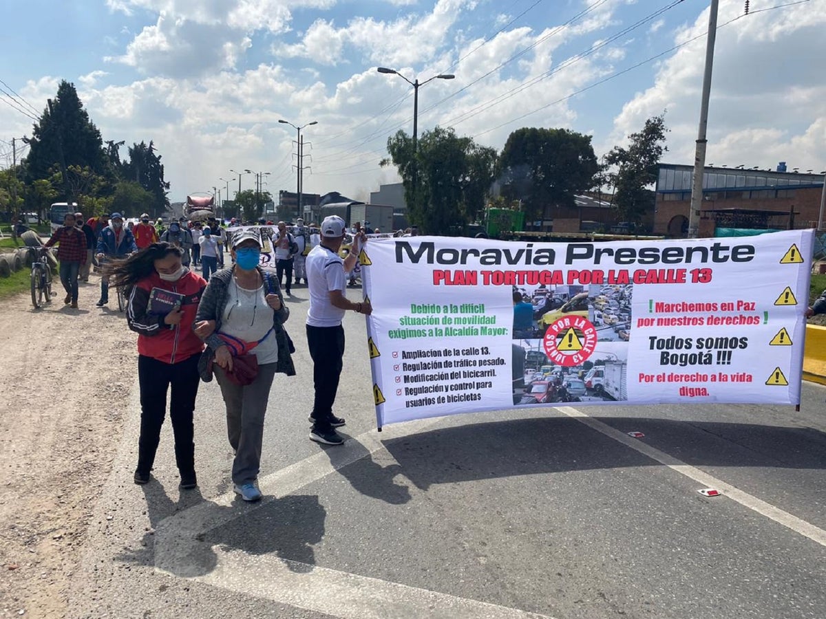 Decenas de ciudadanos que habitan varios barrios de la localidad de Fontibón, al occidente de Bogotá, protestan en la calle 13 exigiendo soluciones de movilidad de la alcaldía y que sea levantada la ciclorruta que fue instalada en uno de los carriles de ese corredor vial.