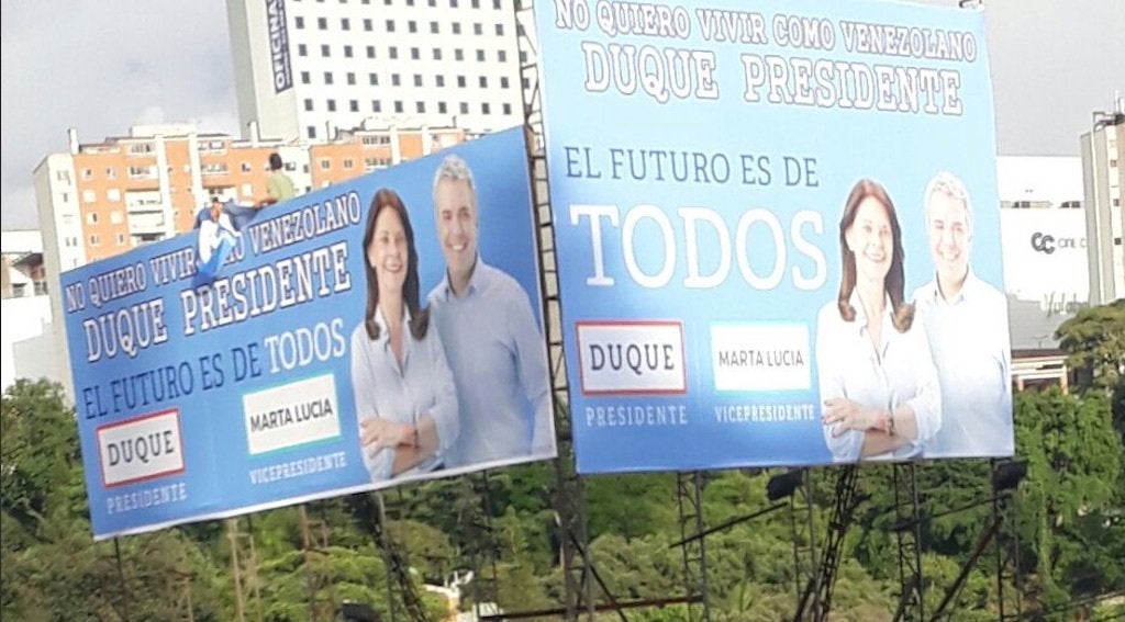 Dos vallas publicitarias con imágenes alusivas a la campaña presidencial de Iván Duque, candidato por el Centro Democrático, han generado varias molestias entre la comunidad venezolana que se ha radicado en Colombia, tras salir de Venezuela a causa de la crisis que enfrenta ese país.