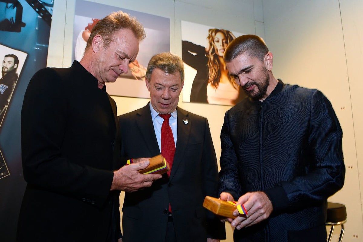 El mandatario, que volvió a lucir una paloma de la paz en la solapa como en todos los actos de estos días en Oslo, resaltó el valor de la música para unir a la gente y agradeció a su compatriota Juanes, que actuó en la gala y fue el encargado de presentarlo, su apoyo al proceso de paz.