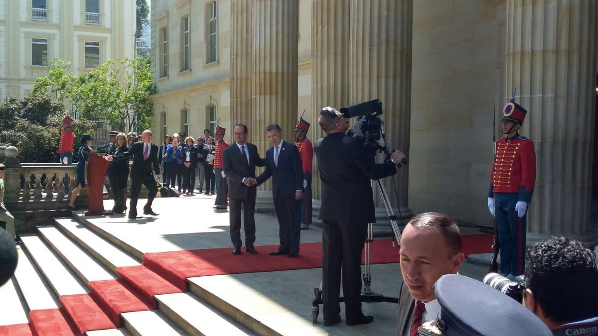 Después de recibir los honores militares por parte del batallón Guardia Presidencial, los presidentes Santos y Hollande entraron a la Casa de Nariño en donde inició la reunión privada y posteriormente se llevará a cabo un encuentro ampliado con varios ministros de cada país, en donde hablarán sobre el apoyo de Francia al posconflicto, los temas binacionales y suscribirán acuerdos en materia comercial, educativa y social, entre otros.