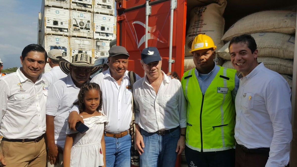 Al embarque de café asistió el presidente Juan Manuel Santos, quien destacó la templanza de los campesinos de esta zona que regresaron a su tierra y lograron ponerla a producir nuevamente.
