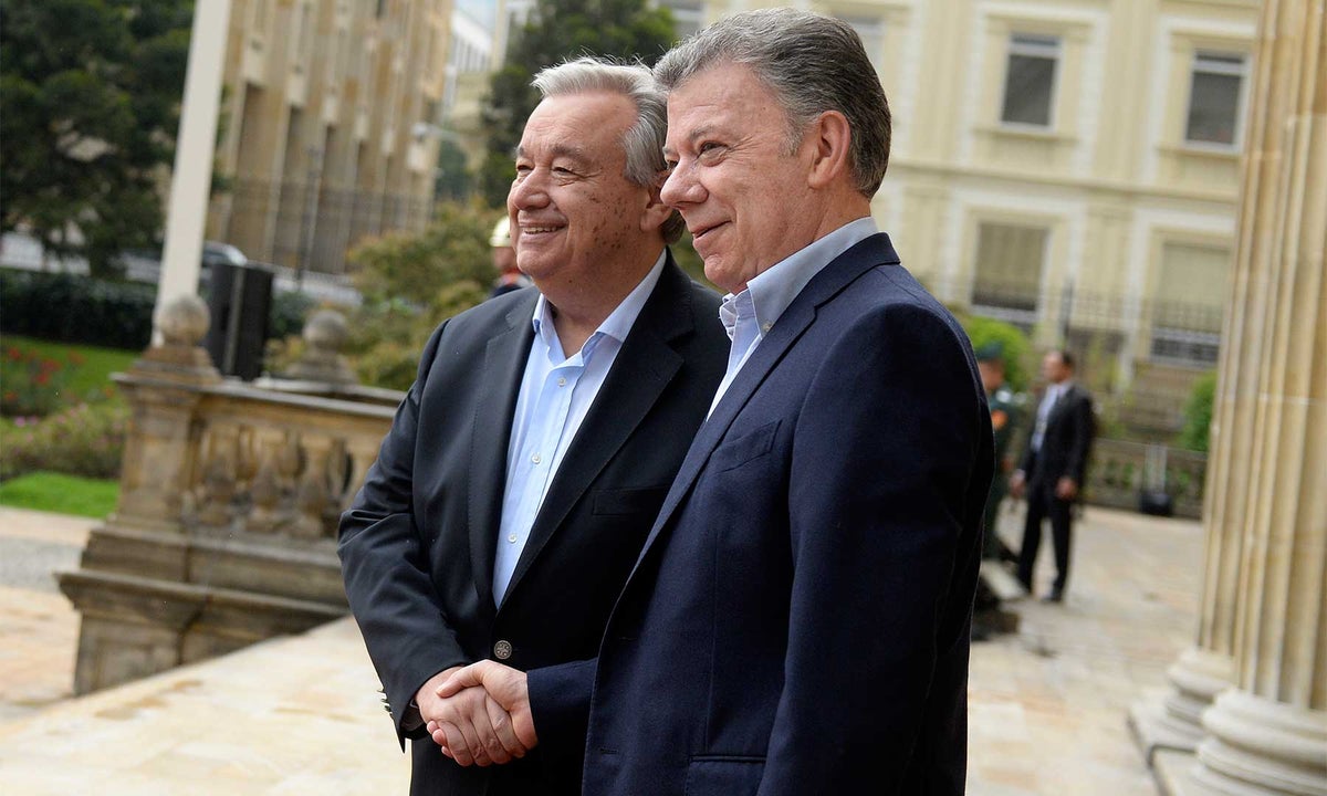 "Quiero aquí reafirmar todo el apoyo de Naciones Unidas al gobierno de Colombia en la construcción de la paz", dijo más tarde Guterres, que por primera vez visita un país latinoamericano como secretario general de la organización, en una alocución televisada junto a Santos en la presidencial Casa de Nariño.