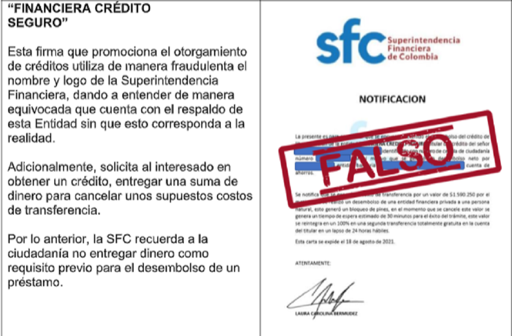 Asimismo, reiteró que no interfiere en los procesos de trámite, gestión, otorgamiento y desembolso de créditos por parte de las entidades vigiladas o de empresas que desarrollan dicha actividad. Por lo que hizo un llamado a la ciudadanía para que no se deje engañar.
