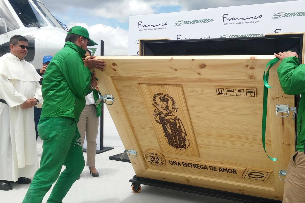 Por su parte Lorena Quintero, ingeniera de embalaje de Servientrega, indicó que el proceso empezó haciendo varios viajes a Chiquinquirá para la toma de medidas de la obra y determinar las características que permitieran transportar la obra con seguridad.