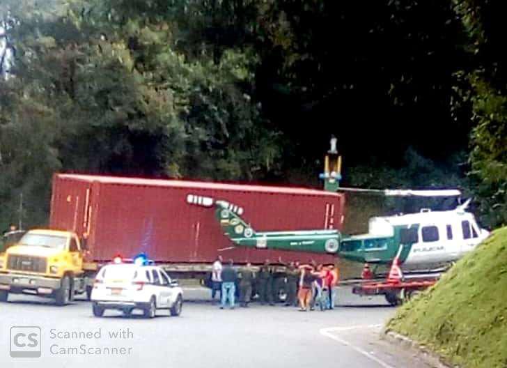 En el traslado pese a que, en la parte delantera y trasera venía acompañado de vehículos con la señalización respectiva de carga larga y patrullas de la Policía, al parecer la imprudencia de un conductor de tractomula, quien no atendió la instrucción de detener la marcha del vehículo a tiempo, hizo que el trailer rozara levemente con la cola del helicóptero.