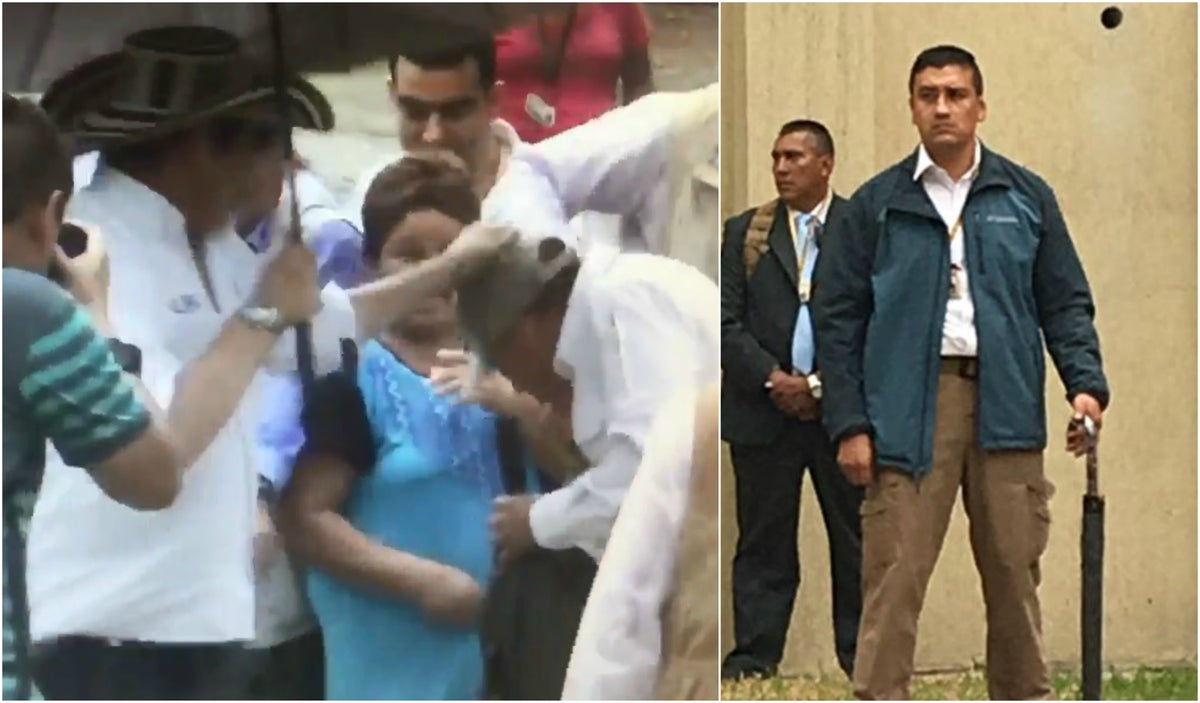 Tras el pisotón, Vargas Lleras reaccionó de forma airada y le dio un sombrillazo al escolta. Tal fue la molestia del vicepresidente, que tras el golpe con la sombrilla luego le dio un coscorrón al hombre de seguridad.