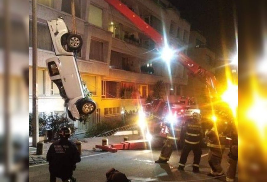 Un aparatoso accidente se registró en la tarde de este martes, cuando una camioneta quedó colgando de un edificio luego de caer 15 metros al vacío cuando se movilizaba por la Avenida Circunvalar con Carrera 92, en el norte de Bogotá.
