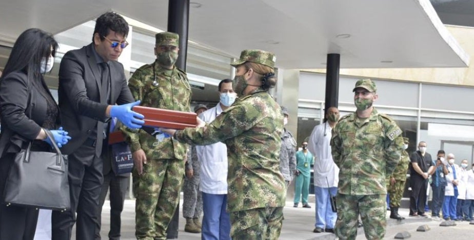 En medio de la sentida despedida, la mayor general Clara Galvis, directora del hospital, se acercó a los familiares para entregarles el pabellón de la Fuerza Aérea Colombiana y expresarles las condolencias por la partida del médico, que dio su vida por atender a los pacientes afectados con coronavirus.
