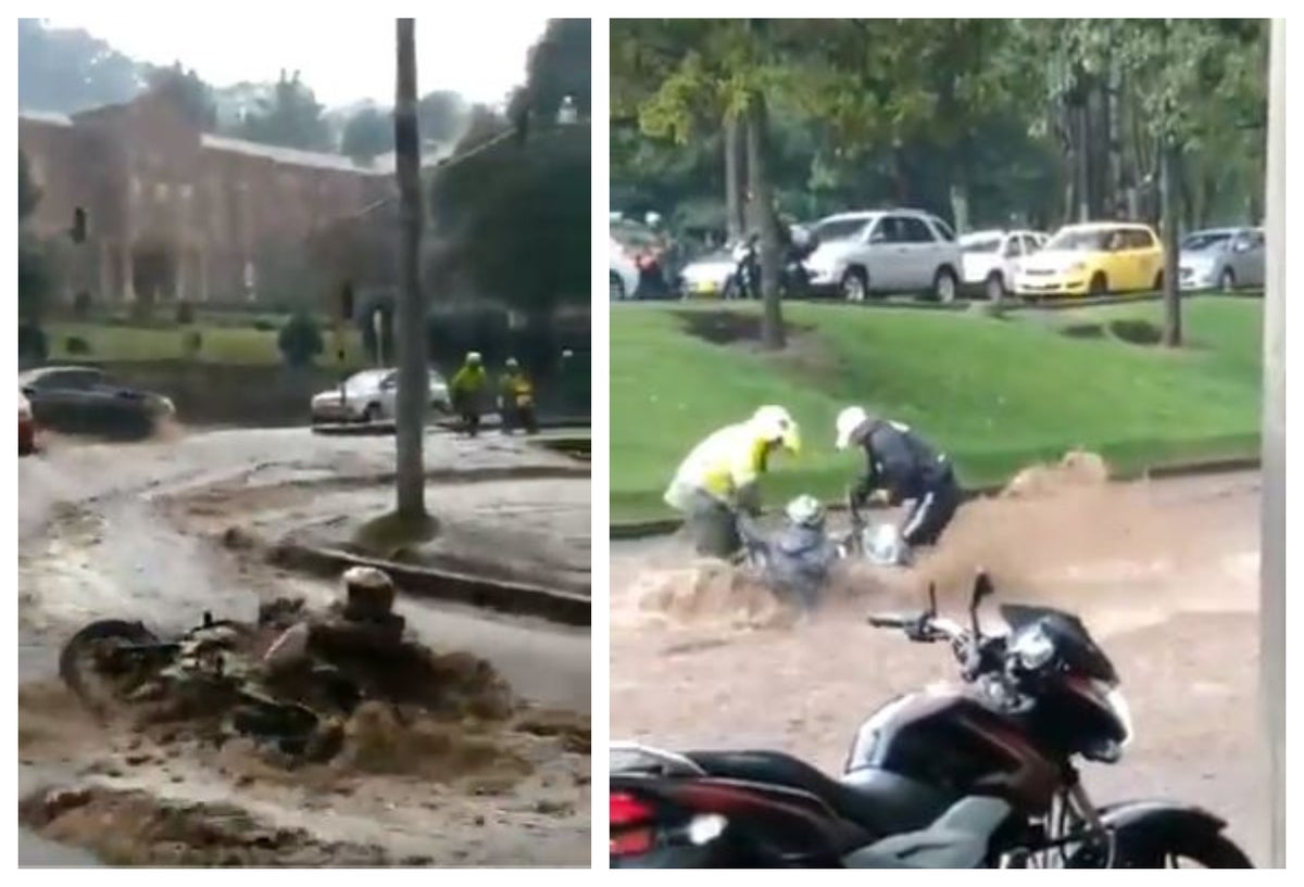 Policías de Chapinero que hicieron presencia en la zona lograron rescatarlo pues la fuerza de las aguas no le permitió ponerse de pie. Luego al menos otros tres ciudadanos se acercaron y ayudaron a levantar el vehículo y llevarlo hasta el andén.