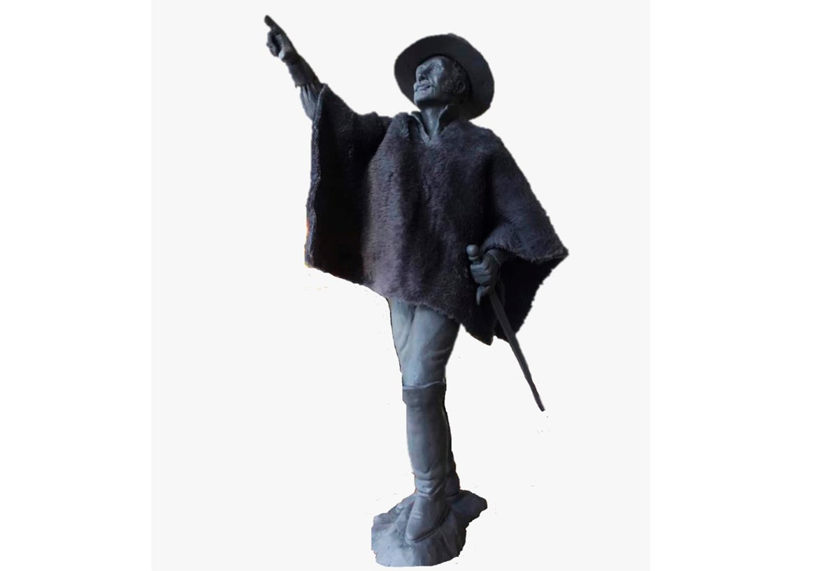 “Es una iconografía poco conocida de un Bolívar con bigote, ruana y sombrero. Reivindica la importancia del campesino en las luchas independentistas y con su espada en la mano y paso apurado señala en el horizonte la estrella que guía a nuestro pueblo a la verdadera y definitiva libertad”, afirma el autor de la obra, Antonio Frío.