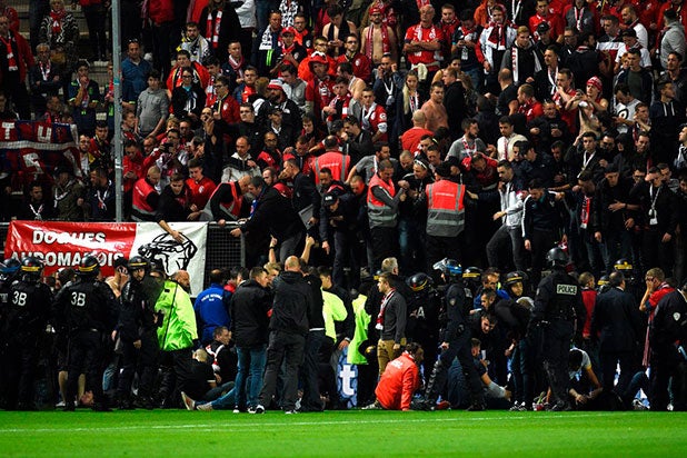 Pasado el cuarto de hora de partido, el gol de Ballo Toure, que ponía por delante a los visitantes, propició agitación en la zona en la que estaban ubicados los seguidores del Lille, que causó la caída de la valla que los separaba del terreno de juego. Los hinchas cayeron desde una altura de un metro y medio, aproximadamente.