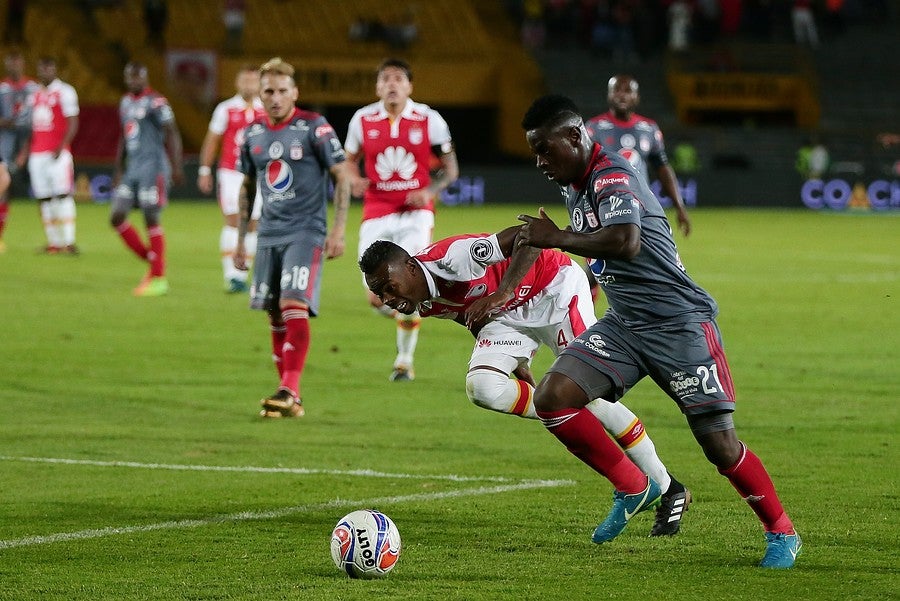 En el primer tiempo ambos equipos salieron con todo y crearon pelotas de gol pensando en abrir el marcador en los primeros 45 minutos. La primera opción clara llegó para Santa Fe al minuto 8 con un remate de media distancia de Armando Vargas que pasó muy cerca del arco de Meneses.